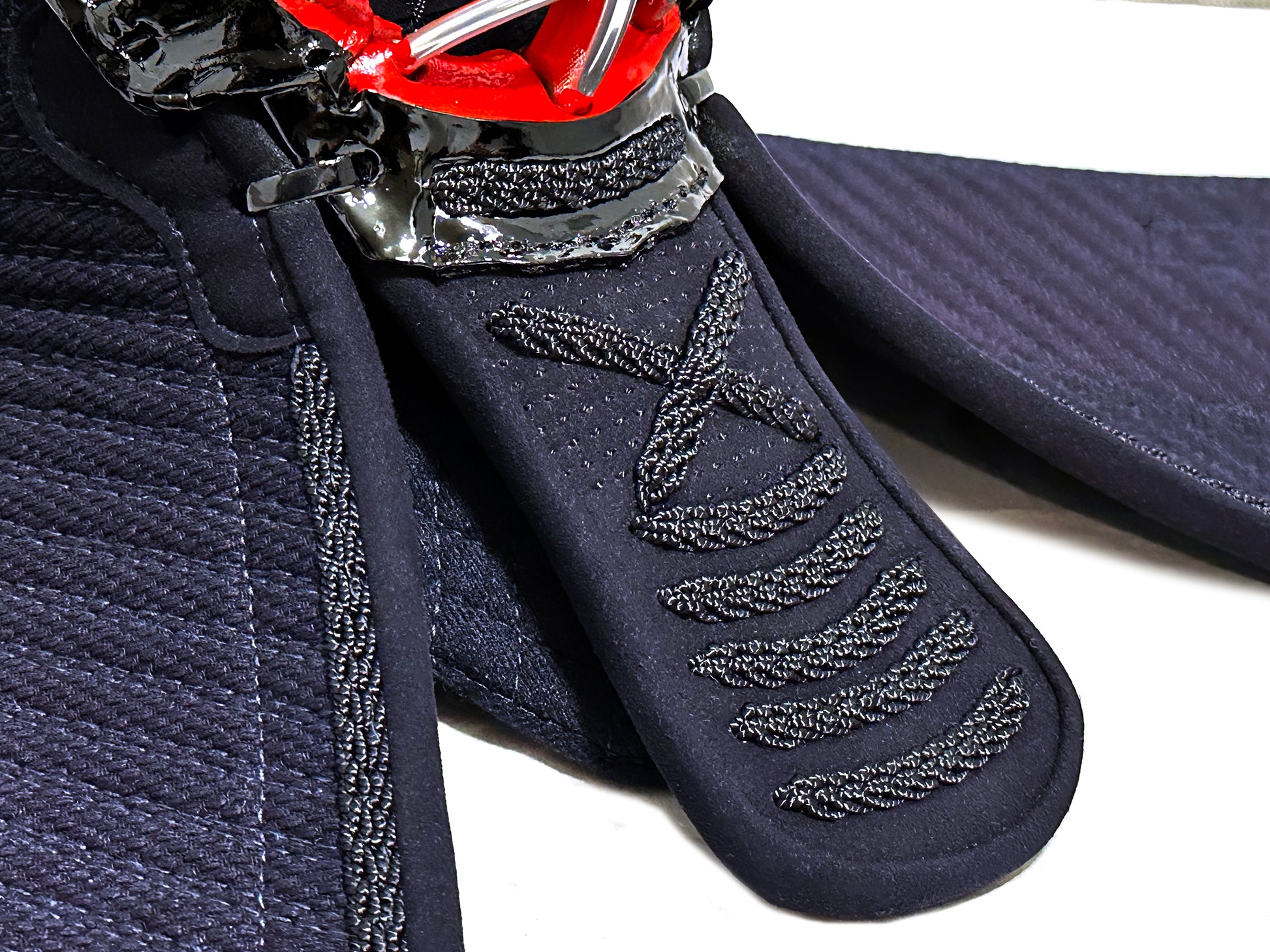 Combining thick yet lightweight Aizome materials and a unique fusion of 8mm and 2mm alternating stitch widths, we have increased the padding in the areas of the Men and Kote that are frequently hit, which gives the Bogu set an added appeal to those who often act as Motodachi, as well as new Kendoka who are concerned about the pains associated with starting Kendo as an adult. We have even added a sewn-in pad to the right Kotebuton for additional protection.