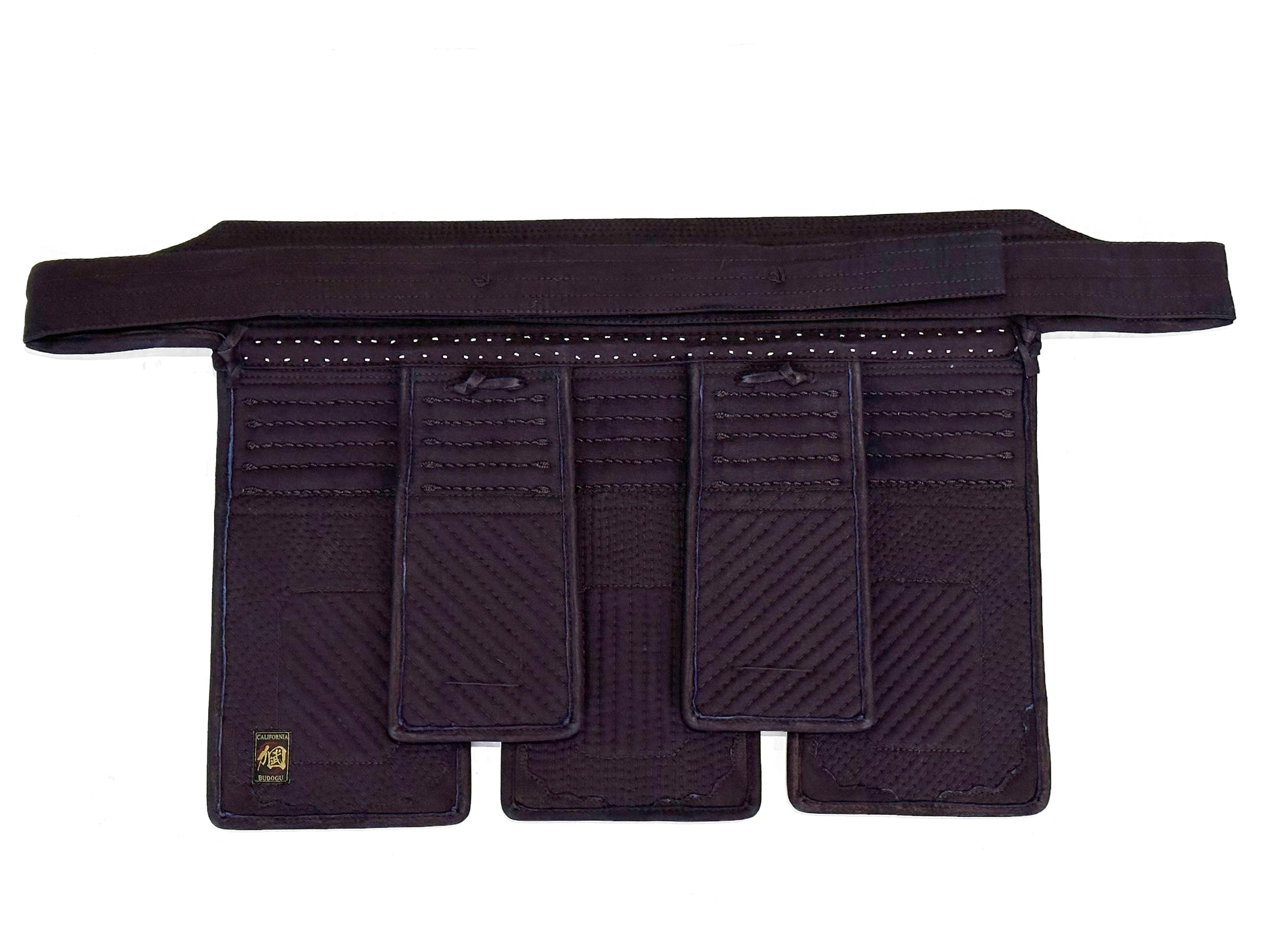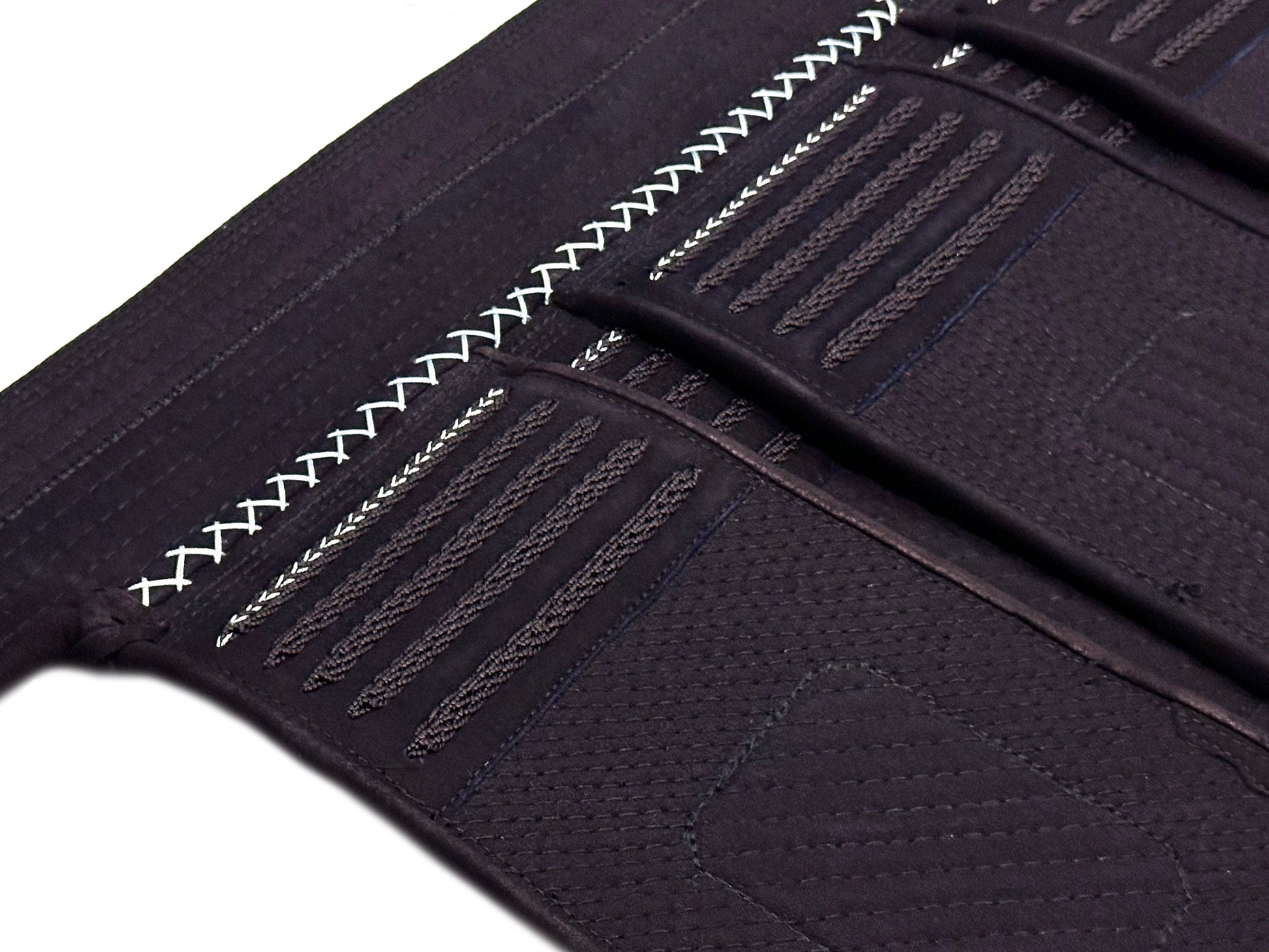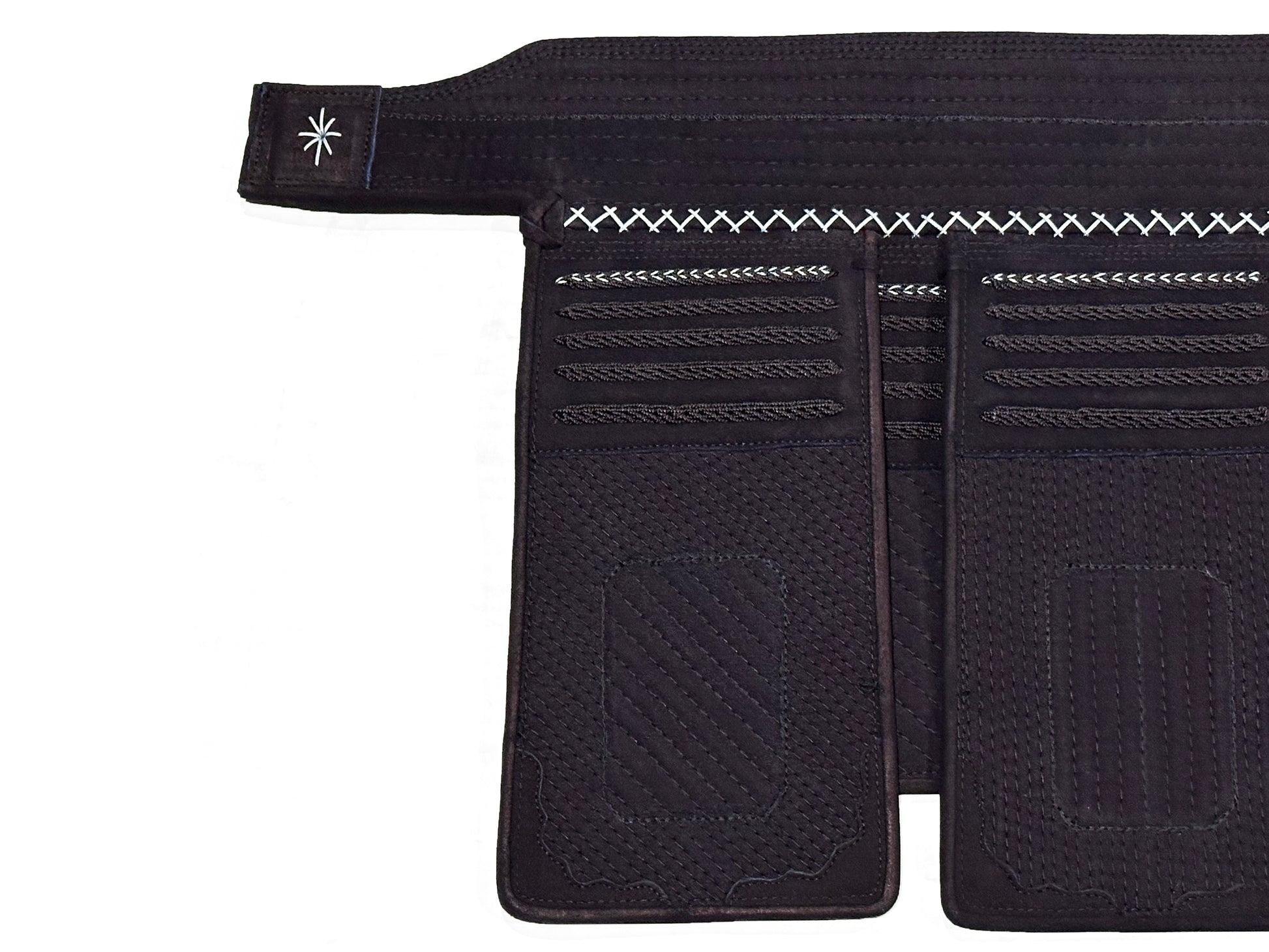The deerskin Tare combines a timeless, traditional shape with modern functionality. It features distinctive 10mm Naname-Gunomezashi pitch stitching on the panels, paired with a thick yet shapable Futon. This unique combination offers enhanced flexibility fused with a contemporary aesthetic, allowing you to shape the Tare effortlessly from day one. As with all our premium sets, the Tare includes lowered top Kazari-Ito for improved durability and elegance. This design minimizes contact with the Do, reducing the risk of rubbing or disheveling the decorative stitching. Additionally, the first 5cm of the Tare Obi are reinforced with deerskin to prevent fraying, ensuring lasting quality.