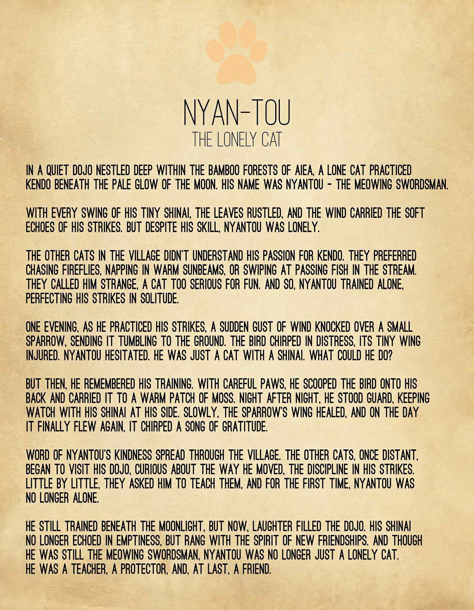He still trained beneath the moonlight, but now, laughter filled the dojo. His Shinai no longer echoed in emptiness, but rang with the spirit of new friendships. And though he was still the meowing swordsman, Nyantou was no longer just a lonely cat.