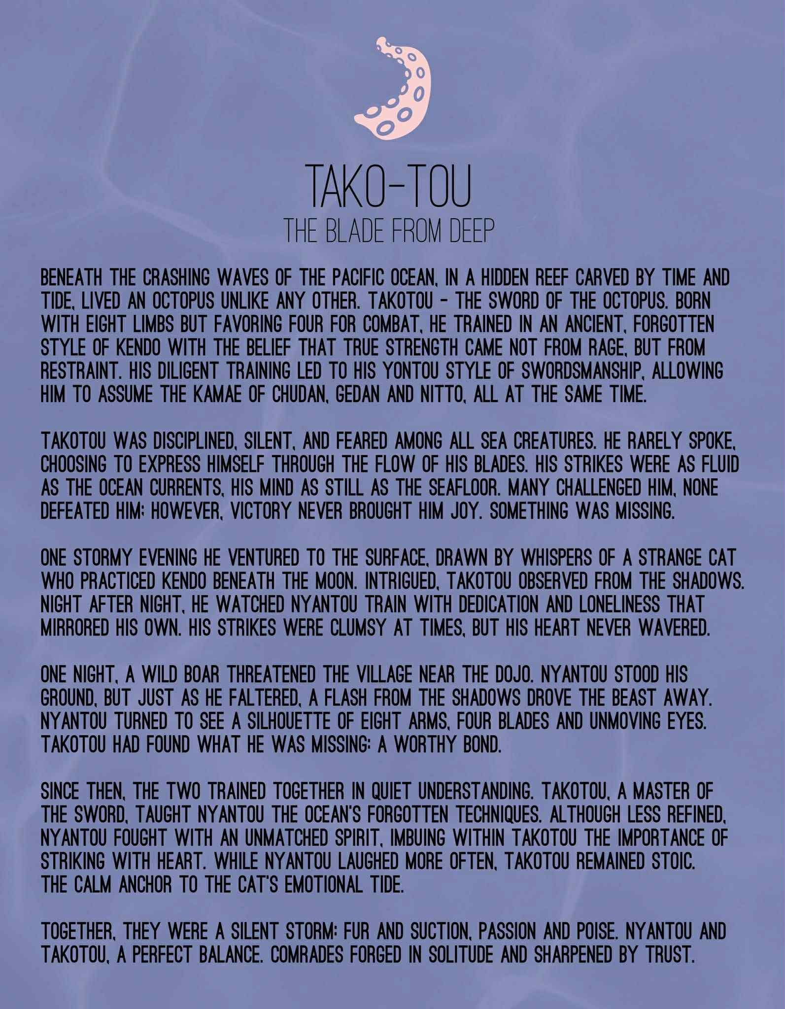 Takotou was disciplined, silent, and feared among all sea creatures, he rarely spoke, choosing to express himself through the flow of his blades. His strikes were as fluid as the ocean currents, his mind as still as the seafloor. Many challenged him, none defeated him: however, victory never brought him joy. Something was missing. One stormy evening he ventured to the surface, drawn by whispers of a strange cat who practiced kendo beneath the moon. Intrigued, Takotou observed from the shadows. Night after night, he watched Nyantou train with dedication and loneliness that mirrored his own. His strikes were clumsy at times, but his heart never wavered. One night, a wild boar threatened the village near the dojo. Nyantou stood his ground, but just as he faltered, a flash from the shadows drove the beast away. Nyantou turned to see a silhouette of eight arms, four blades and unmoving eyes. Takotou had found what he was missing: a worthy bond. Since then, the two trained together in quiet understanding.
