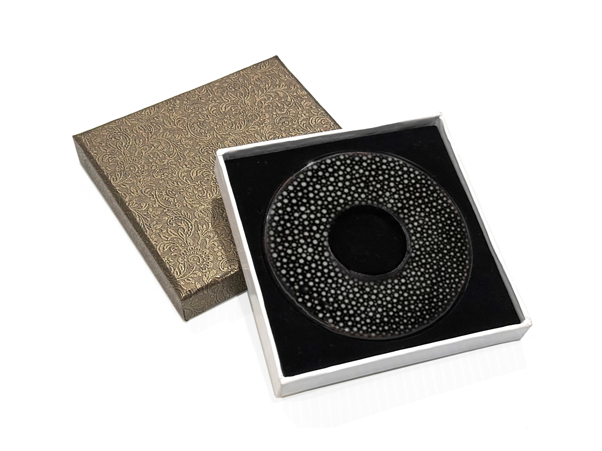 Our Same-Tsuba are available in both black and brown. They make a beautiful gift or chance to reward oneself. Please note that all Same-Tsuba are made with all natural polished rayskin. Due to the nature of the material, the color and design of each Tsuba may slightly vary.