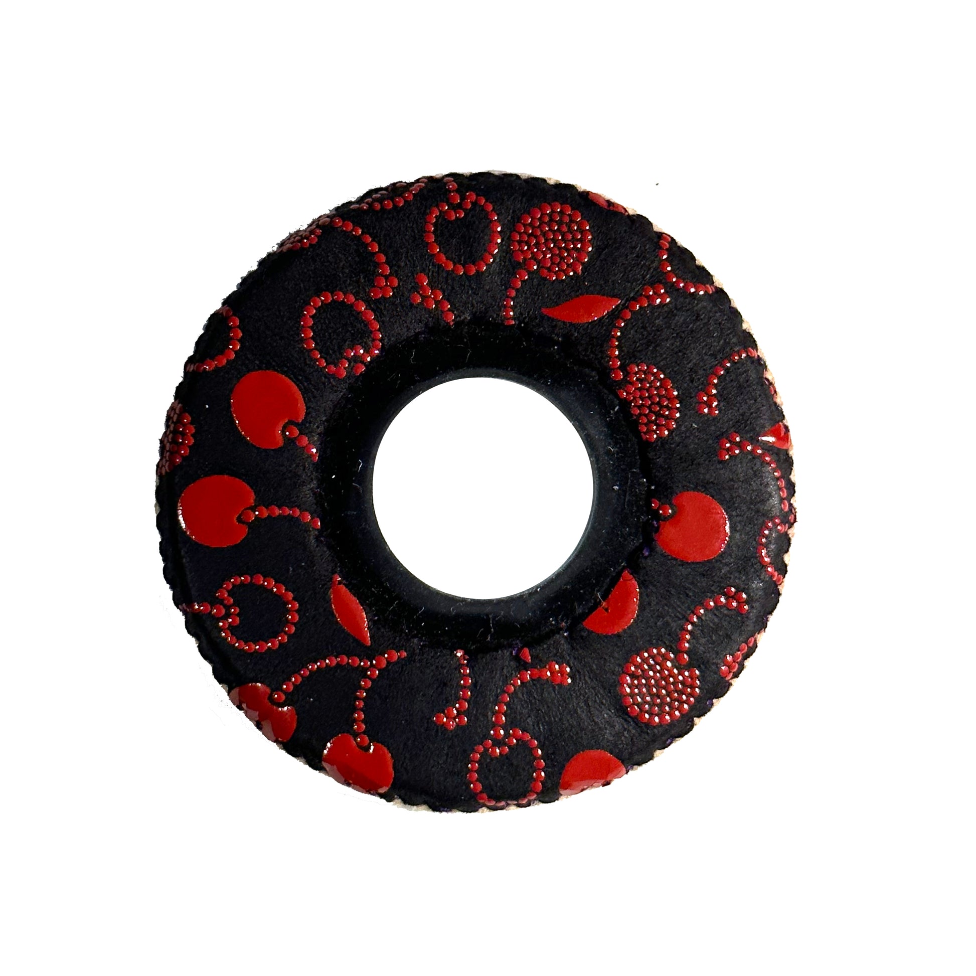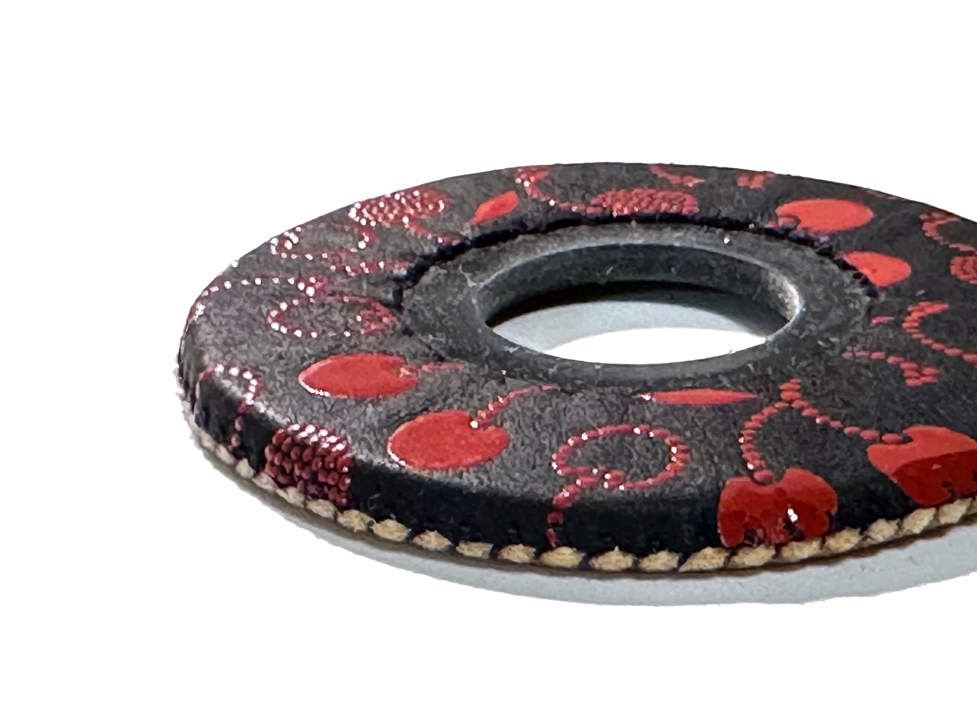 Featuring a unique Sakuranbo (cherry) design, these one-of-a-kind Tsubadome are hand-made by the artist, "Takemasa,"from Chiba Prefecture. Basing his design on some of the highest quality Tsubadome available in the Japanese market, Takemasa has applied his own style to the craft. Utilizing unique Inden pattern and stitching every Tsubadome by hand without the use of a sewing machine, each of Takemasa's pieces are truely work of art.