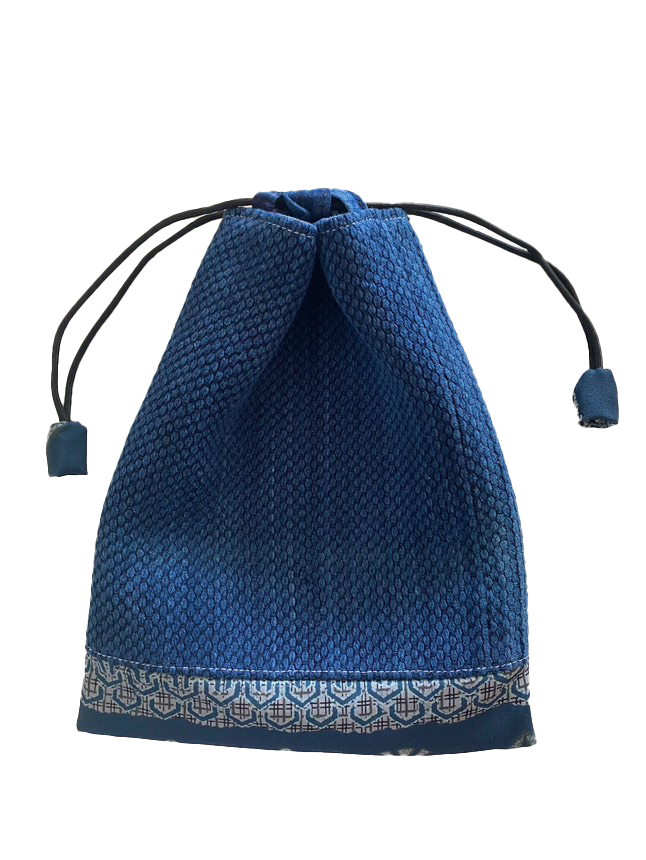 A carefully designed and handcrafted Shingen-Bukuro-style drawstring pouch of upcycled, vintage Kendo Dogi and fabric featuring traditional Japanese designs. Perfect for carrying small personal items during tournaments or for trips!