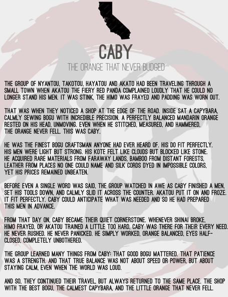 That was when they noticed a shop at the edge of the road. Inside sat a capybara, calmly sewing bogu with incredible precision. A perfectly balanced mandarin orange rested on his head, unmoving. Even when he stitched, measured, and hammered, the orange never fell. This was Caby.