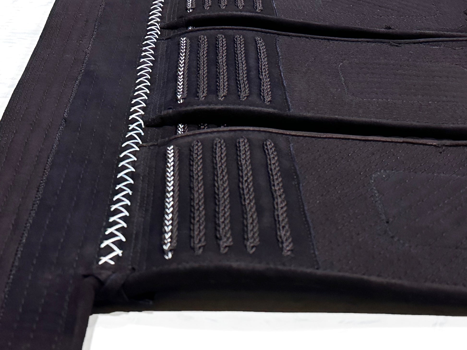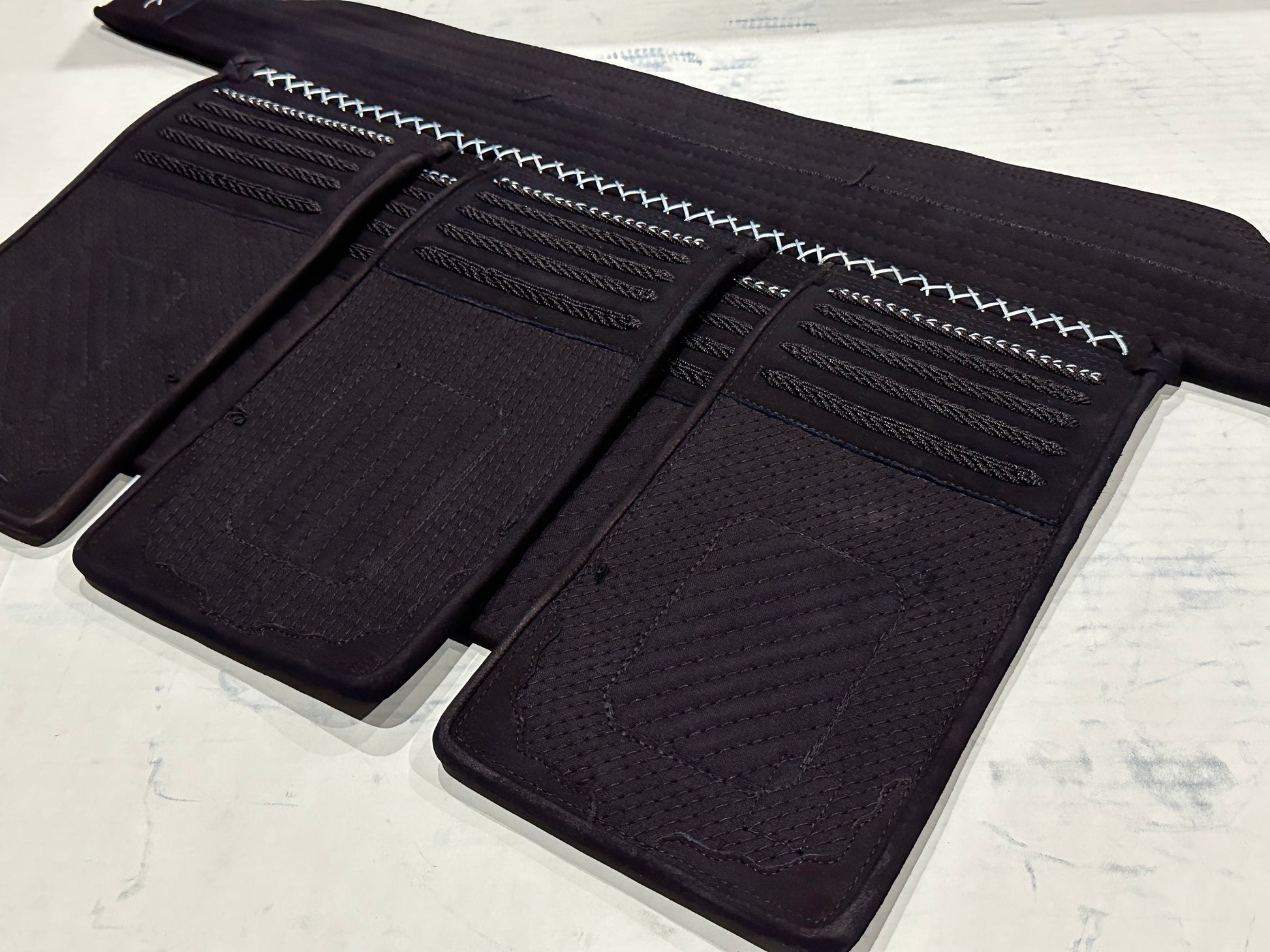 The deerskin Tare combines a timeless, traditional shape with modern functionality. It features distinctive 10mm Naname-Gunomezashi pitch stitching on the panels, paired with a thick yet shapable Futon. This unique combination offers enhanced flexibility fused with a contemporary aesthetic, allowing you to shape the Tare effortlessly from day one. As with all our premium sets, the Tare includes lowered top Kazari-Ito for improved durability and elegance. This design minimizes contact with the Do, reducing the risk of rubbing or disheveling the decorative stitching. Additionally, the first 5cm of the Tare Obi are reinforced with deerskin to prevent fraying, ensuring lasting quality.